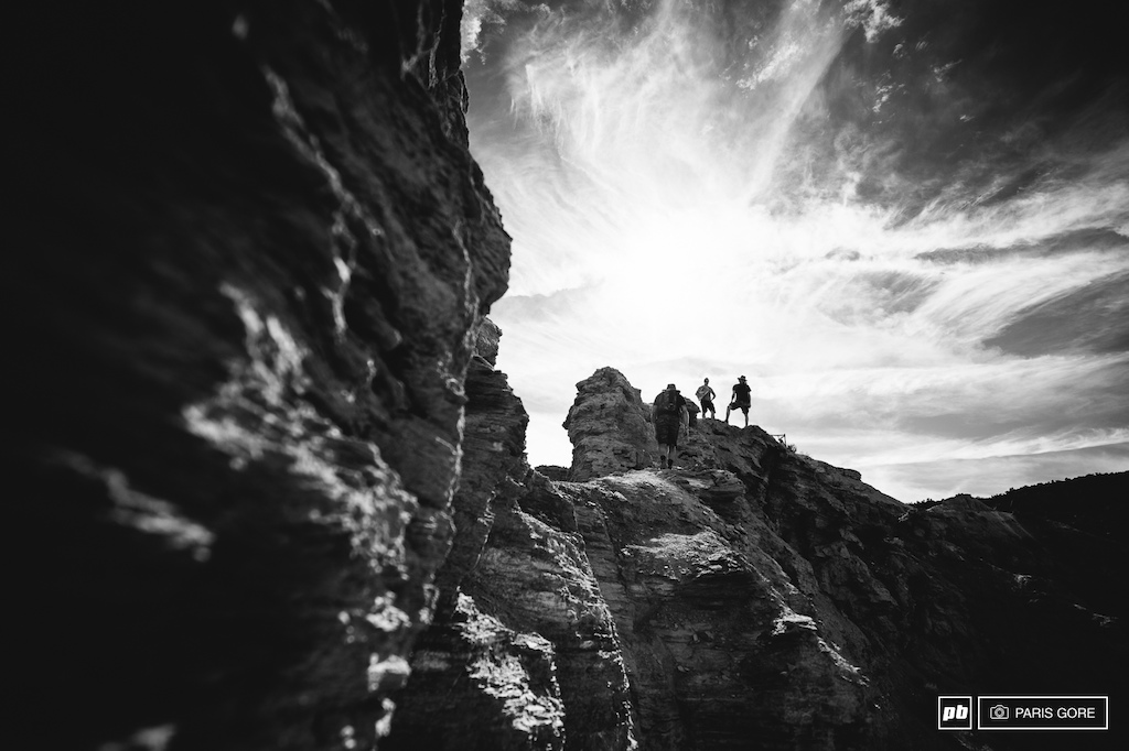 Working under the top two cliffbands in an area that will see Aggy, Gully, Antoine Bizet and Semenuk air above a certain death canyon, we have to first build a platform just so we can freaking stand, slowly carving in singletrack that no one would ever want to ride ever. Except for some crazy Frenchman. All over the course, guys fill sandbags and build rock walls, chip away at sedimentary rock one quarter sized chunk at a time, all the while dealing with savage dust storms that literally block your nasal tubes with booger build up.